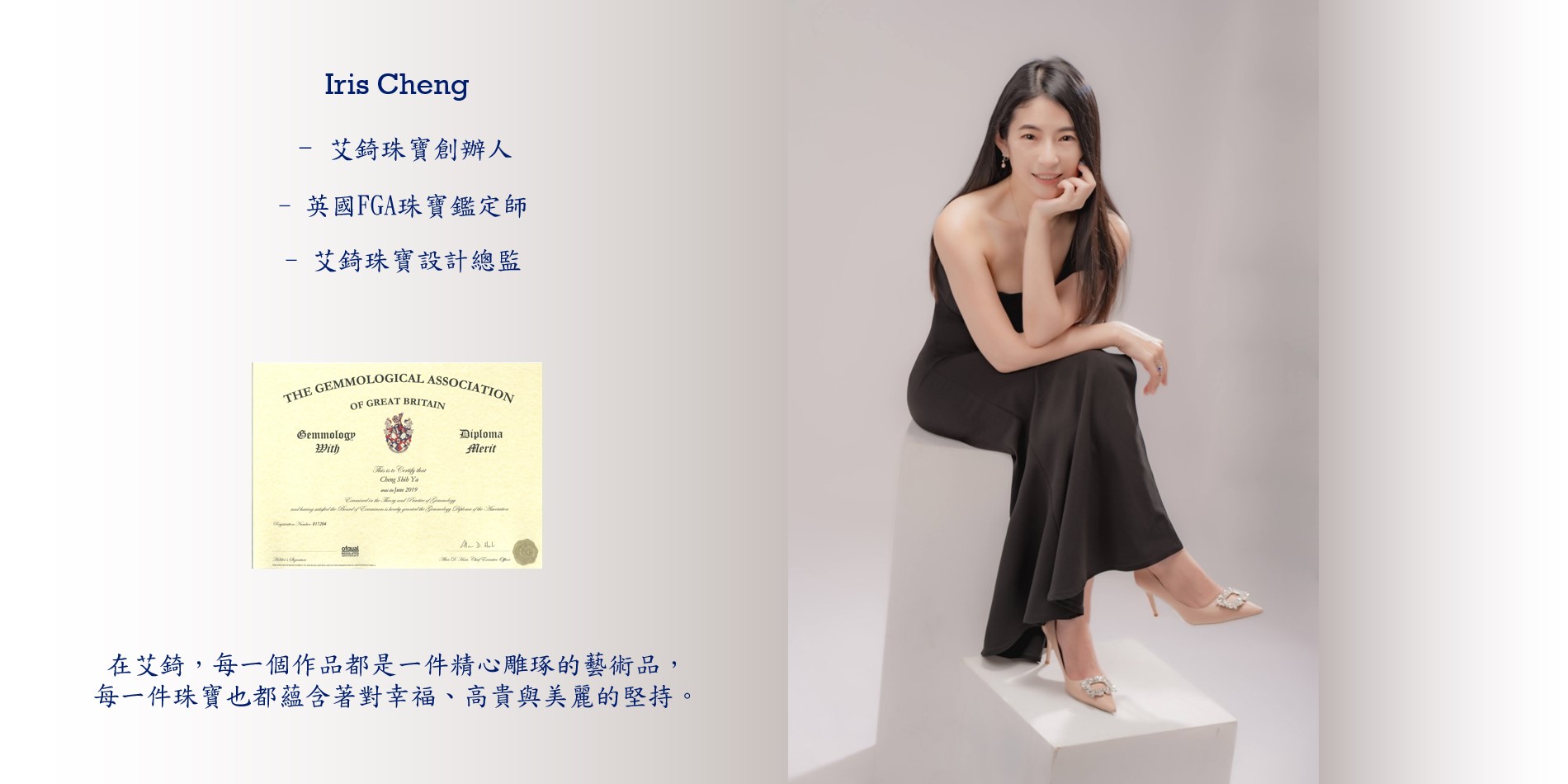 設計師介紹 英國FGA珠寶鑑定師 Iris Cheng 艾錡珠寶的創辦人,同時擔任該品牌的設計總監,並擁有英國FGA珠寶鑑定證照。 作為一名珠寶鑑定師,她對珠寶擁有獨特的品味和熱情。 在獲得英國FGA珠寶鑑定師資格後,她持續深入研究翡翠鑑定,並專注於珠寶設計。 由於對珠寶設計的美感和工藝有著高度的要求,Iris 不斷精進自己的技術,並持之以恆地深入研究珠寶。 這種堅持不懈的追求不僅是她對顧客的承諾,也是對珠寶的真摯熱愛。 艾錡珠寶 | 高雄珠寶 ICHI JEWELRY 給您幸福的珠寶 經歷