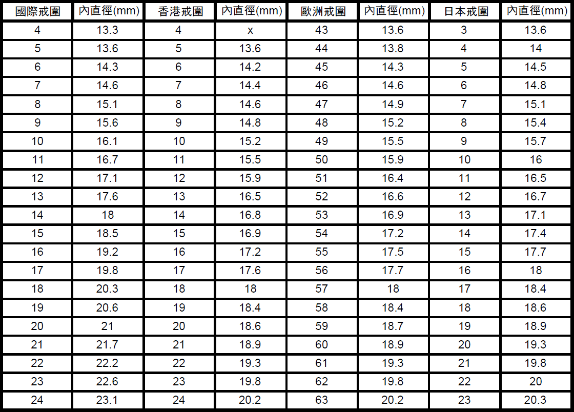 各國慣用戒圍尺寸表- 艾錡珠寶使用的是國際戒圍